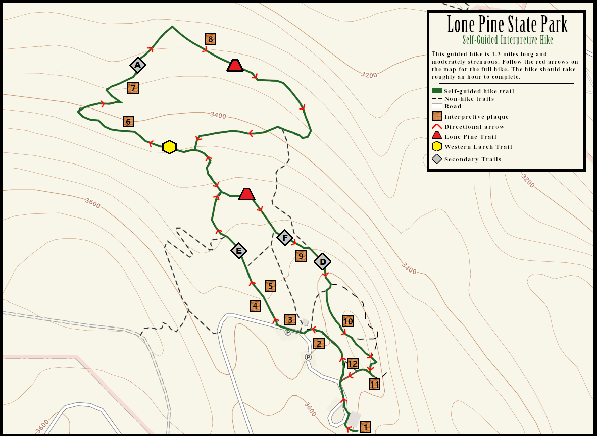 Lone Pine State Park is a great place to hear and see many resident birds like the Mountain Chickadee, Black-capped Chickadee, Red-breasted Nuthatch, Northern Flicker, Hairy Woodpecker, Pine Siskin, Pine Grosbeak, and Brown Creeper.